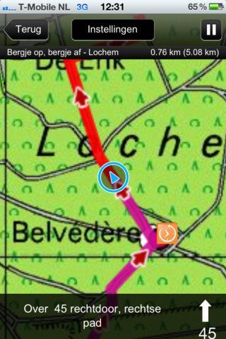 Routes die je aangeschaft hebt, zie je terug in het tabblad Mijn Routes. Druk er een aan en je route wordt geladen op een offline kaart waarin je eigen positie middels GPS wordt bijgehouden. Je kan instellen dat je een audiosignaal krijg als je je richting in de route moet veranderen – als een volleerd navigatiesysteem – en je kan een signaal laten afgaan als er een interesse op de route onderweg is waar je gerust even aandacht aan kan besteden. De iPhone-app begeleidt je van een foto en omschrijving.
