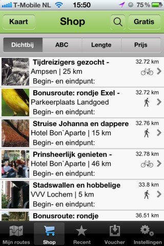 Net als BeleefRoutes draait AbelLife zijn hand niet om voor in-app aankopen die je kan doen om routes aan te schaffen. Bij AbelLife koop je de routes in bundels, waar je al snel een paar euro’s voor neerlegt. Het mooiste van Twente kost bijvoorbeeld 11,99 euro. Fietsen vanuit Muntendam en Mooi kort – Ootmarsum zijn de goedkoopste pakketten routes en kosten 2,39 euro per stuk. Er zijn routes met allerlei thema’s: fietsen langs meren, moderne Belgische architectuur in Twente, bijzondere bomen in de kop van Overijssel en ‘hotspots rond de Dom’. Bij elke route die je in de Shop bekijkt, zie je een aantal foto’s, een algemene omschrijving en tips voor horeca onderweg. Met de knop Bekijk bundel zie je tot welk pakket een route behoort en hoeveel je ervoor kwijt bent.