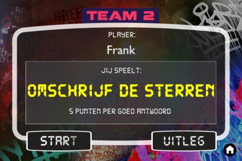 In Omschrijf de Sterren moet een deelnemer van het team bekende Nederlanders omschrijven die de rest van het team moet raden. Voor elk goed antwoord ontvang je vijf punten. Uitbeelden geniet hetzelfde principe, maar laat je dingen in gebaren uitdrukken – zoals bijvoorbeeld een spiekbriefje of een tuinkabouter.