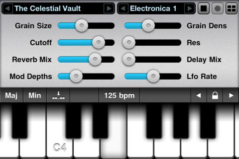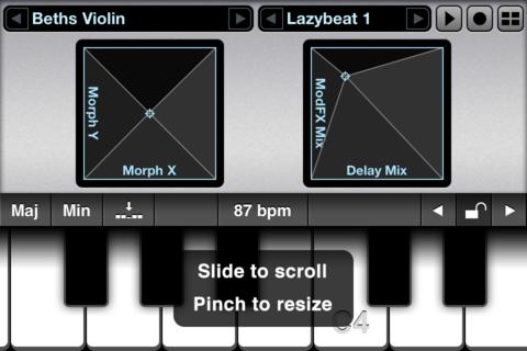Ook als met synthesizers omgaan niet je terrein is, is het leuk om met de mogelijkheden van Alchemy Synth Mobile te spelen. Het beeld bestaat altijd uit een keyboard waarvan je zelf de grootte van de toetsen kan instellen. Daarboven zijn verschillende schermen op te roepen: acht sliders om effecten mee te veranderen, twee vlakken om de morph, modfx en reverb mix (ja die!) in te stellen, er is een scherm met acht presets en tenslotte is er nog een scherm met zes sliders voor algemenere opties zoals het algehele volume en het loop-volume.