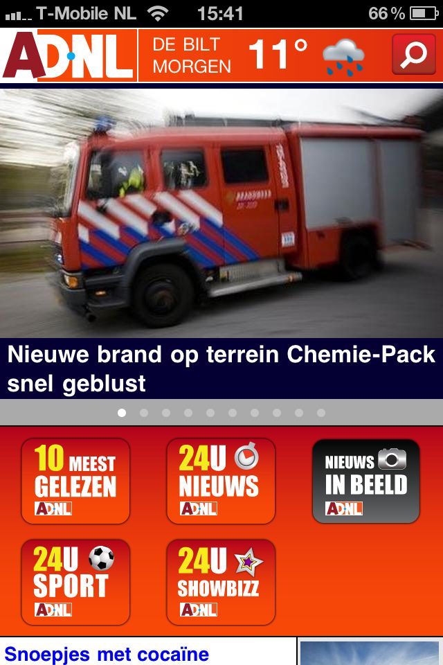 Het Algemeen Dagblad heeft voor haar eigen website AD.nl een iPhone-applicatie uitgebracht. Deze is vanaf vandaag te vinden in de App Store. Zoals je van een nieuwsapplicatie mag verwachten houdt deze je op de hoogte van de belangrijkste actuele gebeurtenissen in Nederland en in de wereld. In het hoofdscherm vind je de headlines met foto’s waar je doorheen kunt ‘swipen’. Ook staat bovenin de weersverwachting voor de volgende dag. Tevens kun je met het vergrootglas zoeken naar onderwerpen of woorden in de tekst. Al lijkt dit niet geheel vlekkeloos te werken: wij kregen geen resultaten bij willekeurige zoekopdrachten.