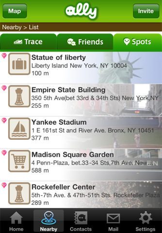 Net als in andere plaatsbepalende diensten kun je ‘inchecken’ op bestaande locaties of er zelf een aanmaken. Vrienden zien dan waar je op dat moment uithangt. Als je de applicatie opent, kom je terecht in een scherm waarin de laatste update van een vriend boven in het scherm staat. Daarnaast heb je echter een ‘live trace’-functie, waarmee je de locaties van vrienden live kan zien. Als je de applicatie beide hebt open staan, kun je elkaar aan de hand van Ally vinden op een kaart. Nadeel is wel dat het constant doorgeven van een locatie batterij slurpt. Een voorbeeldscreenshot uit de App Store laat zien dat een locatie soms ook bij benadering is en niet exact wordt getoond.