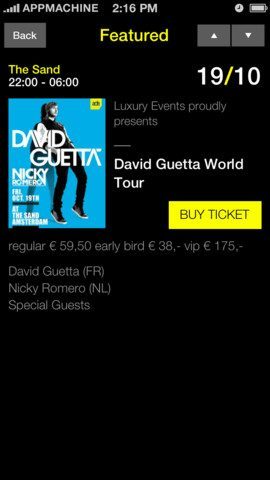 Wie het Amsterdam Dance Event vooral aandoet om te dansen, zal verheugd zijn met de soms aanwezige directe kaartverkoop vanuit de applicatie. Voor weer andere feesten en evenementen, word je in de app doorgestuurd naar de website van de locatie waar het plaatsvindt en kan je daar kaarten bestellen.