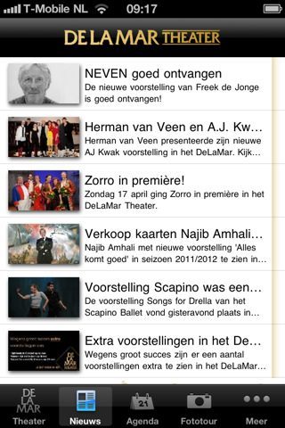 De agenda zelf is de troef van de applicatie. In tabbladen kun je zoeken op datum, voorstelling of genre. Bij datum en genre kun je respectievelijk de maand en het genre in een submenu onder de tabbladen selecteren. Bij de datum wordt het nog iets drukker. Dan staat er nóg een beweegbaar menu onder met de data zelf. Je moet de eerste keer even goed kijken om er je weg in te vinden. Een andere mogelijkheid is de ‘Fototour’, maar die naam is wat teveel eer voor de twaalf foto’s die je van het theater kan bekijken. Anderzijds is het aardig dat alle berichten en voorstellingen beeld hebben en soms zelfs video’s van DeLaMar zelf.