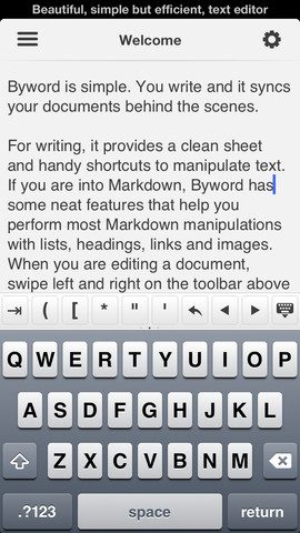 Byword (€2,39) – Een minimalistisch en stijlvol vormgegeven schrijf-app waarin je tekst kan opmaken met in de app uitgelegde markdown-code, om het vervolgens door te zetten naar Dropbox of online te synchroniseren via iCloud.