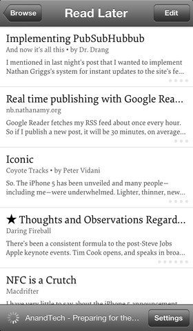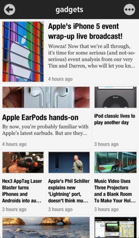 Newsify (€0,79) – Zet op Reader.google.com websites klaar die je wilt volgen en Newsify presenteert het laatste nieuws ervan in een strakke layout die doet denken aan moderne krant. Visueler en strakker dan ooit op de iPhone 5.