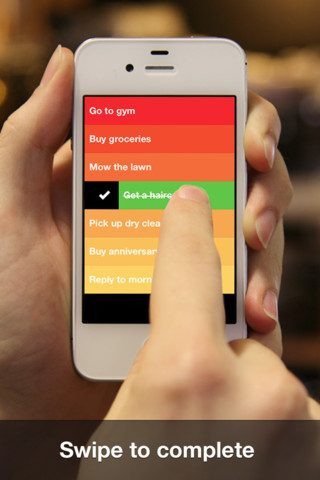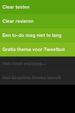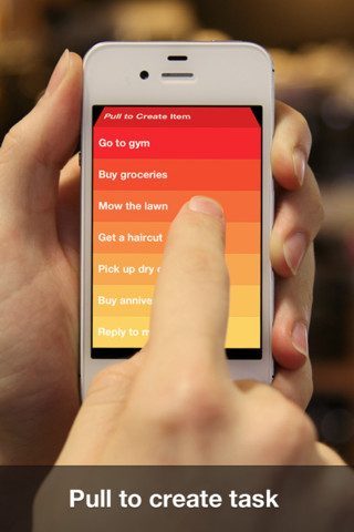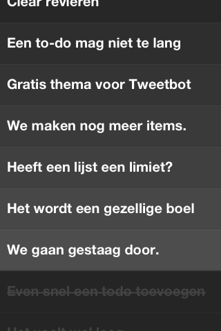 Alle handelingen in Clear zijn even intuïtief. Geen enkele is vergezocht en de totale bediening van de app heb je in vijf minuten spelen onder de knie. Swipe een item naar rechts en je vinkt hem af, swipe een item naar links en je verwijdert hem. Een gevinkt item komt transparant onder je actieve taken te staan. Je hoeft hem alleen maar op te pakken en naar de lijst actieve taken te slepen, om hem weer te gebruiken. Zo kan je alle taken oppakken en verslepen in de rangorde. De gedachte daarachter is dat het bovenste item op je to-do altijd het meest belangrijke is. In het standaard geactiveerde thema van Clear is het bovenste item dan ook felrood, om al snel over te gaan in oranje tot geel. Druk buiten de lijst op het scherm en je maakt een nieuw item aan. Druk op de tekst van een taak of lijst en je kan de tekst aanpassen. Trek een lijst even naar beneden om een nieuw item bovenaan de lijst toe te voegen, trek de lijst nog verder naar beneden om naar een bovenliggende pagina te gaan. Door een lijst helemaal naar boven te duwen, verwijder je de afgevinkte taken. Dat duidt de app keurig aan met een melding ‘Pull to clear’. Het mag dan intuïtief in gebruik zijn; de app waarschuwt je nog wel als je een ingrijpende verandering wil uitvoeren. Helaas gebeurt dat soms ook in de standaard blauwe pop-up van de iPhone, die eigenlijk een beetje vloekt met het ontwerp van Clear.