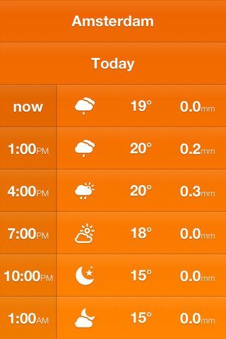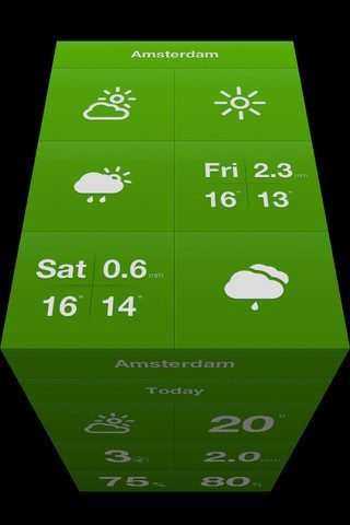 De kracht van Clear is dat er geen knoppen bij komen kijken, maar dat alles bedient met veegbewegingen die je snel genoeg door hebt. Weathercube is erin geslaagd dat concept feilloos over te zetten naar een weer-app, maar niet voordat je een aantal instructies ter introductie hebt afgewerkt die je wel even moet volgen om de applicatie onder de knie te krijgen. Het hoofdscherm toont het weer op de huidige locatie, door de kubus naar boven te bewegen zie je het overzicht van de volgende zes dagen en aan de onderkant zie een overzicht per drie uur van de huidige dag, tot één uur ’s nachts. Door de kubus horizontaal te bewegen op de hoofdscherm, kan je ook de uitgebreide weergegevens oproepen voor de komende drie dagen – en door vervolgens weer naar onderen te bewegen, zie je ook het urenoverzicht van die dagen. Tussen locatie wisselen doe je door de plaatsnaam opzij te vegen. Het is een kwestie van er even mee spelen en het werkt subliem.