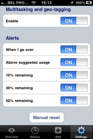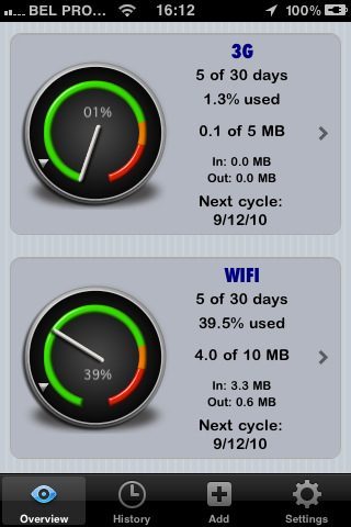 Het dataverbruik wordt zowel visueel als in tekst weergegeven en is onderverdeeld in 3G/GPRS-verbruik en Wi-Fi. Je kunt instellen wanneer je nieuwe factuurperiode van start gehad, zodat je precies per verbindingsmethode kunt bijgehouden hoeveel data je gebruikt. Ook kun je instellen hoe hoog een eventuele datalimiet is, zodat je kunt zien hoeveel je daarvan al hebt gebruikt. Het is mogelijk om waarschuwingen in te stellen bij het overschrijden van de limiet, als je boven het gemiddelde komt en als er nog 10%, 30% of 50% van je datalimiet resterend is.