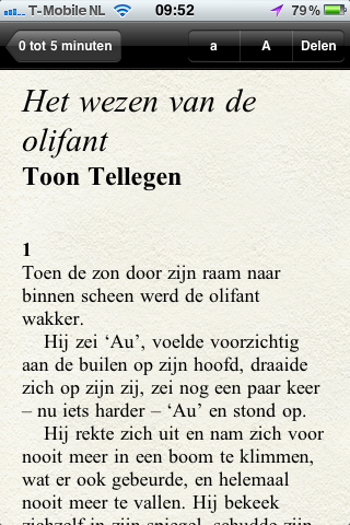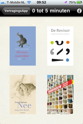 Je vindt in de VertragingsApp een goede 18 verhalen, allemaal verschillend in lengte en verzameld door uitgeverijen Athenaeum, Nijgh & Van Ditmar, Querido en Q. Ze zijn allemaal opgedeeld in een leestijd van 5, 10, 15, 20, 25, 30, 45 en 60 minuten. Veruit de meeste verhalen zijn korter dan 15 minuten en alles gebundeld moet goed zijn voor driehonderd pagina’s aan tekst. Er komen flink wat bekende namen voorbij in de applicatie: de verhalen zijn geschreven door onder andere Franz Kafka, Hans Dagelet, Arnon Grunberg en Toon Tellegen.