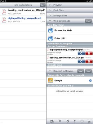 GoodReader (€3,99) – Een tablet kan door zijn formaat eigenlijk niet zonder een degelijke pdf-lezer. GoodReader is sinds de lancering uitgegroeid tot een van de meest uitgebreide applicaties die je hiervoor zult vinden. Zoals verwacht kun je hier pdf’s en ook sommige andere bestandsformaten in openen, maar de manier waarop je ze in de app kunt laden is ontzettend handig. Je koppelt er namelijk je Dropbox, Google Docs en ftp-accounts aanvast, waarna je vanaf hier je bestanden naar de iPad kunt downloaden.