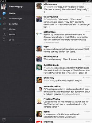 Twitter – De Twitter-app voor de iPhone lijkt qua ontwerp erg veel op zijn concurrentie, met een enkele tijdlijn in beeld en knoppen onderaan om naar andere pagina’s te wisselen. De iPad-app van Twitter pakt het daarentegen totaal anders aan met zijn uitschuifbare panelen. Wanneer je iets in de tijdlijn aantapt, schuift er een paneel vanaf de rechterkant op je scherm naar binnen. Deze kun je buiten het scherm zetten om later te bekijken, of uitvergroten zodat hij je volledige beeld opvult. Het kan soms wat chaotisch zijn, al die informatie verspreid over je scherm, maar je hebt wel alles in beeld.