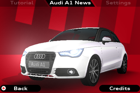 Bij het opstarten van de game kom je in een scherm met de volgende drie opties: Options, Leaderboard en Play Game. Bij het tikken op Options krijg je vervolgens een scherm met vijf opties: Tutorial, Audi A1 news, Settings, Back en Credits. Het leek mij handig om eerst eens de instructies (tutorial) te bekijken.