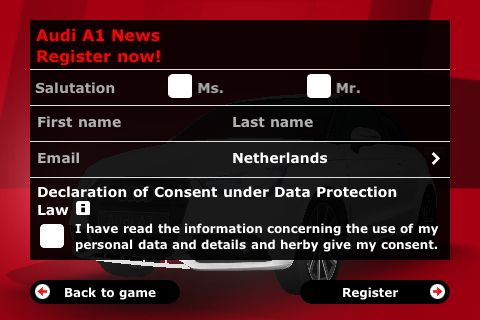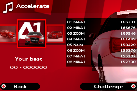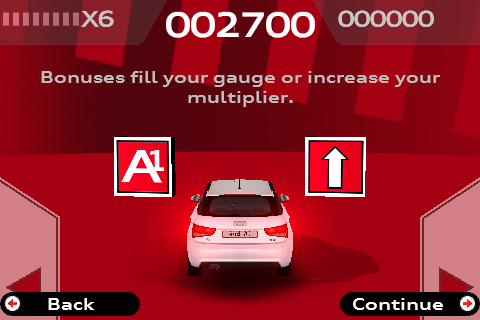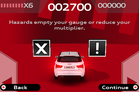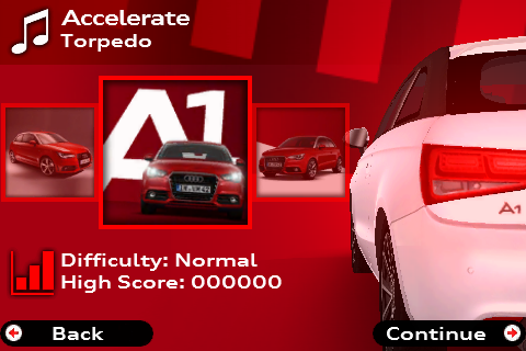 En dan waar het uiteindelijk allemaal om gaat: tik in het hoofdmenu op Play game om te spelen. Je komt bij een scherm waar je een circuit kunt kiezen. Je ziet verschillende foto’s van de Audi A1 in coverflow met onder de foto de moeilijkheidsgraad (Normal of Hard) en daaronder je hoogste score tot nu toe. De circuits met de ranking Hard zijn bovendien te herkennen aan een zwarte gloed over de afbeelding. Elk circuit heeft zijn eigen nummer dat begint te spelen zodra je op de desbetreffende afbeelding hebt getikt.