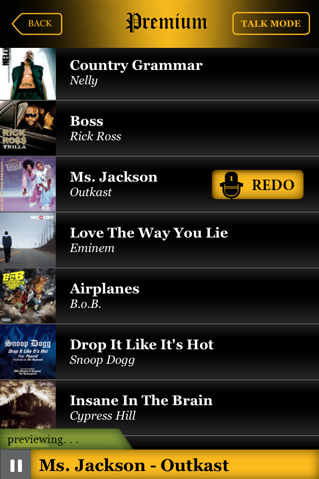 In de applicatie vind je een boel populaire nummers, zoals California Love van 2Pac, maar ook beats van artiesten als Eminem, Snoop Dogg, Outkast, Beastie Boys en Nicky Minaj zijn te vinden in de app. De applicatie zal de beat van deze nummers laten versmelten met de geknipte en vervormde versie van jouw stukje tekst. De app past ongeveer alles aan je ingesproken tekst aan, zoals de pitch, snelheid en de app husselt zelfs de stukjes woorden door elkaar op sommige momenten. De app werkt het beste als je maar een kort stukje tekst inspreek, van één of twee zinnen lang. Behalve deze modus waarin je moet praten, is er ook een rapmodus, waarin je kunt meerappen op een van de liedjes. Je stem wordt dan amper aangepast of bewerkt.