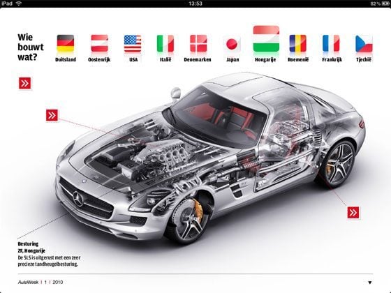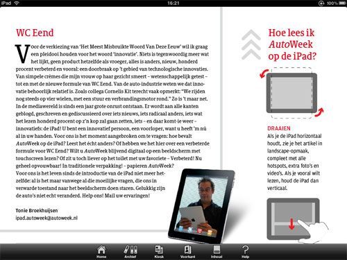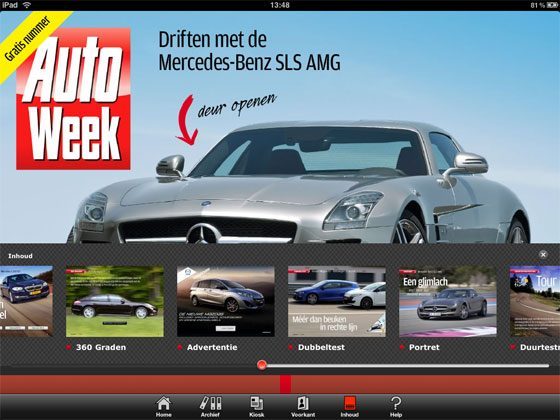 Maar het meest opzienbarende is natuurlijk het magazine. AutoWeek gaat elke week, naast het papieren blad, een speciale versie van het iPad-magazine uitbrengen. Daarin is minstens 50% van de artikelen verrijkt met extra foto’s, video’s en andere extra’s. Het eerste blad is gratis te downloaden. Momenteel is het alleen mogelijk om losse nummers te kopen, maar in de toekomst komt er ook een abonnementsoptie. Dat zou welkom zijn, want het kopen van een los nummer in de winkel (€1,99) is goedkoper dan de iPad-versie (€2,99).
