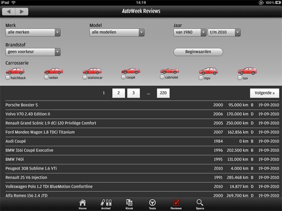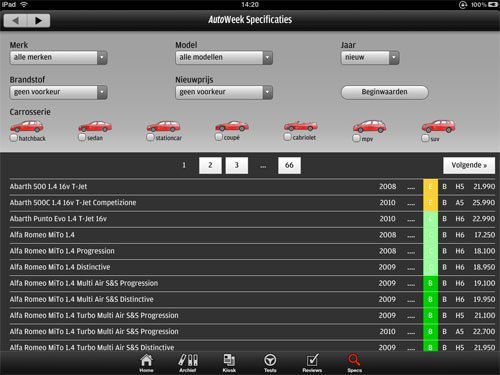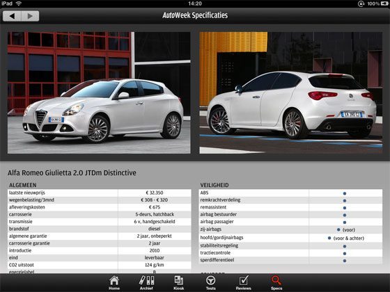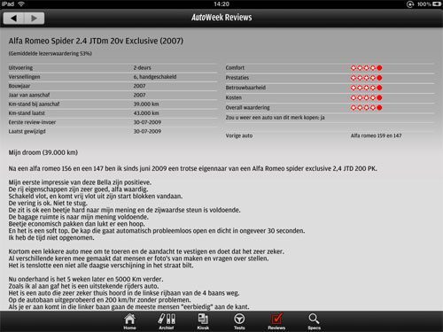 De makers van Autoweek besloten eigenlijk op het laatste moment het gratis proefnummer in te voegen. Eigenlijk zou de app na installatie drie onderdelen bevatten: Tests, Reviews en Specs. Die informatie kun je overigens ook al in de iPhone-applicatie van AutoWeek vinden, die je gratis uit de App Store kunt downloaden. Op de iPad krijg je wel een veel breder overzicht: