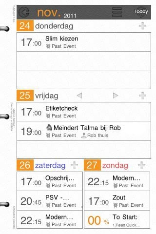 Awesome Calendar heeft het stijlvolle pagina-omslag effect dat we kennen van e-books en tijdschriften op de iPhone en iPad. Dat is ook niet zo raar, want delen van de applicatie zijn opgemaakt alsof ze uit papier zijn opgetrokken. Zo kan je ruim zestig stickers kiezen vanuit de applicatie om op een maandoverzicht te plakken en is de weekkalender een geval apart. In feite spreekt de app wel van een weekkalender, maar dat is het niet. Het deelt de week op in een aparte pagina voor maandag, dinsdag en woensdag en een pagina voor donderdag, vrijdag en zaterdag en zondag gedeeld over een kolom. Net als een papieren agenda. Elke dag heeft een lijstje van drie regels waarin je door de agendapunten heen kan scrollen. Je kan niet op een specifieke dag drukken voor een dagoverzicht waardoor alles in beeld komt. Een dagoverzicht komt wel in beeld als je de iPhone kantelt.