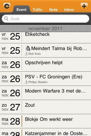 Er is ook nog een andere manier om de agenda en punten erin te bekijken. Daar kom je met de lijst-knop vanuit het maandoverzicht. Het laat van elke dag de verschillende agendapunten in één oogopslag zien (maar helaas wel zonder tijdstip) en met tabbladen erboven kan je behalve de agenda, ook de verschillende to-do lijsten en notities eenvoudig onder elkaar zien. Je kan altijd op een item drukken om de bijbehorende informatie erover te zien.