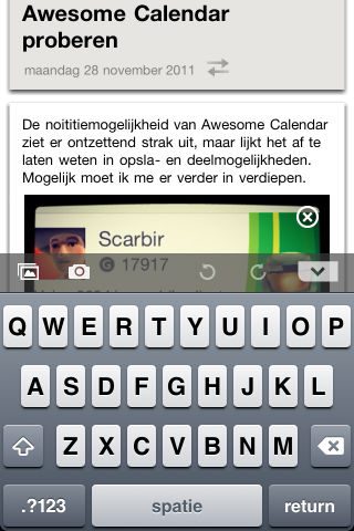 In de horizontale positie of met een plusje in het halve week of lijst-overzicht, kan je items aan de agenda toevoegen. Je hebt daarbij de keuze uit een nieuw agendapunt, een to-do lijst of een notitie. Dan valt al snel op dat Awesome Calendar de functies niet onder een overkoepelend agendapunt samenpakt, maar dat het losse onderdelen zijn. Dat betekent dat alleen de agendapunten synchroniseren met de standaardagenda van de iPhone. Op elk deel valt bovendien wel wat aan te merken. Zo kan je bij een agenda-afspraak niet alle standaardalarmen van de iPhone toevoegen. Je kan twee dagen tot een half uur van tevoren gewaarschuwd worden voor een afspraak, maar de opties 5 minuten ervoor of op het tijdstip zelf, zitten er niet in. Ook zit er geen notitiemogelijkheid aan een agenda-item zelf vast. Daardoor kan je de aantekeningen bij eerder gemaakte agendapunten niet lezen. Ridicuul, temeer omdat er wél een losse notitiemogelijkheid in de app zit!
