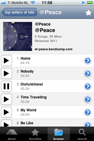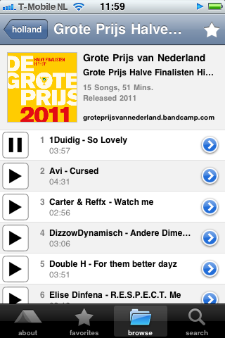 De nieuwe iPhone-applicatie Bandcamper voelt aan als de officiële mobiele uitlating van de site. Slechts de indeling van tabbladen is wat raar gekozen en de optie om albums of tracks te kopen, ontbreekt. Luisteren kan echter op dezelfde manier als de 3Voor12 Luisterpaal en eigenlijk als elke cd. Je zet een track op en de lijst speelt automatisch de tracks die eronder staan. Nummers worden volledig afgespeeld en reclame is nergens te zien of te horen. Met een sterretje rechts bovenin beeld kan er een plaat als favoriet gemarkeerd worden.