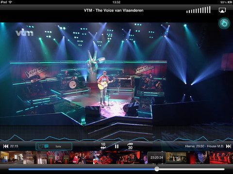 De videospeler van Stievie is een handig ding. Behalve met een slider onderin beeld, kan je de voortgang van de video ook bekijken in een balk met thumbnails om delen van de uitzending direct te selecteren. Bij het kijken kan je met een snelmenu links in beeld (op de iPhone onder) direct naar andere scenes van de uitzending gaan, maar ook direct naar andere zenders gaan om live te kijken. Via het snelmenu komen ook de sociale functies van de app naar voren. De AirPlay-functionaliteit om het beeld van de iPhone en iPad door te sturen naar je televisie, maakt Stievie af.