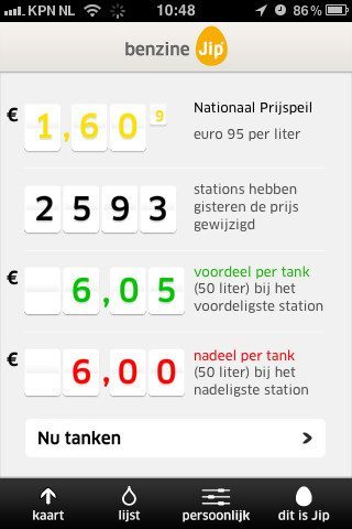 @zilli: De benzine-Jip toont ook diesel en zelfs LPG, super loodvrij en premium brandstoffen. Naar eigen voorkeur in te stellen in de app, net als het aantal liters per tank en eventuele selecties op merken.