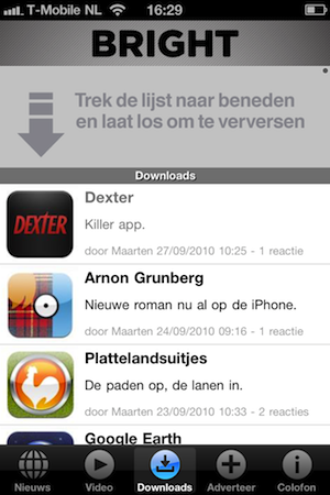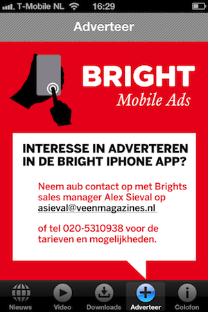 Het techlifestylemagazine Bright heeft vandaag een update van de iPhone-applicatie uitgebracht. Versie 2.0 bevat voor het eerst advertenties, die volgens het persbericht “op ingenieuze wijze” naast de redactionele inhoud getoond worden. Bright wilde (net als Apple’s iAds) geen platvloerse banners, maar mooie advertenties die niet schril afsteken tegen de normale content. TomTom is de eerste adverteerder, die via de nieuwe app de navigatiesoftware voor de iPhone aanprijst. Bright 2.0 heeft een restyling en een nieuwe indeling voor content gekregen. De app ondersteunt iOS 4.0 en heeft een nieuw cachingmechanisme gekregen waardoor de app nog sneller werkt.