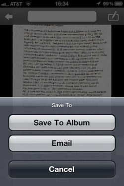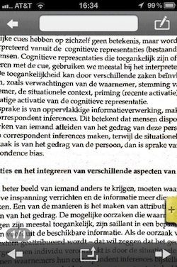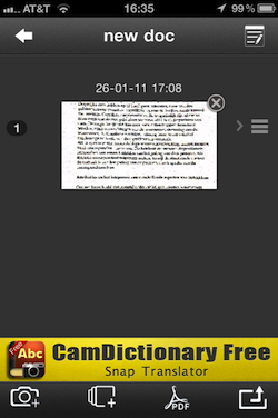 Ik heb CamScanner Free geprobeerd in combinatie met een studieboek. Je maakt een foto, geeft aan waar de randen van de tekst liggen en laat de app de tekst optimaliseren. Dat werkt prima bij zwarte letters op een witte achtergrond, maar heb je tekstkaders die grijs zijn of een andere achtergrondkleur hebben, dan is het resultaat veel korreliger. CamScanner gebruikt een anti-shake-technologie om te zorgen dat je foto niet mislukt omdat je teveel met je hand beweegt. Je kunt documenten van meerdere pagina’s met elkaar combineren. De app zorgt voor automatisch bijsnijden en aanpassen van kleur en helderheid. Heb je een aantal afbeeldingen gemaakt, dan kun je ze opslaan in je camerarol of omzetten naar een PDF. Je hebt daarbij zelfs keuze uit meerdere papierformaten, zoals Letter, A4 en B5. Het PDF-bestand stuur je vervolgens per e-mail naar jezelf of anderen. Daarnaast is het mogelijk om je scans te uploaden naar Google Docs, Evernote, Dropbox, MobileMe iDisk of Box.net.