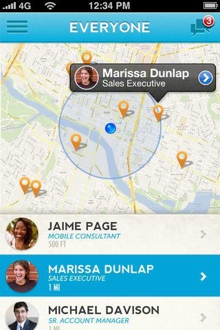 De andere functie van CanWeNetwork heet Everyone, en laat alle gebruikers van de app op een kaart zien met de meest nabije personen onderaan de kaart uitgelicht met naam, profielfoto en functie. Als de app dadelijk veelvuldig gebruikt wordt, kan je op die manier bijvoorbeeld snel een webdesigner uit de omgeving vinden en daarmee meteen, via chat en pushberichten of via LinkedIn, contact leggen. Het principe is ijzersterk.