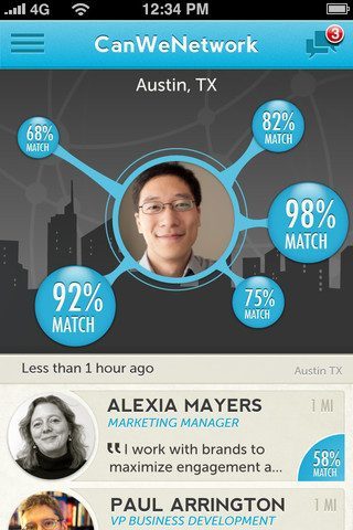 Met alle sociale netwerken en smartphones die je kan koppelen aan je huidige locatie, zou je zeggen dat er allang een ingeburgerde app moet zien waarmee je eenvoudig interessante personen in de buurt moet kunnen vinden. Toch is dat niet het geval. De iPhone-app Sonar probeerde het al eens zakelijk maar kwam niet echt van de grond en Highlight leek even de volgende hype te worden op de SXSW-conventie in maart dit jaar, maar slurpte de batterij leeg waardoor de app al snel uit de spotlight verdween. CanWeNetwork is een nieuw initiatief dat het weer op zakelijk gebied probeert.