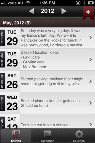 De applicatie maakt gebruik van donkergrijze en donkerrode elementen in de layout en laat je tekst schrijven op een lichtgrijze in plaats van een witte achtergrond. Dat is best slim: als je in bed je dagboek nog even bijwerkt, word je niet zo snel geplaagd door het felle licht van de app. Een andere aardigheid is – hoewel het niet erg bijzonder is – dat je de reeds geschreven dagverslagen zowel in een lijst met de laatste stukken kan zien, als in een kalenderweergave waarin je de maand van voorkeur kan bekijken.