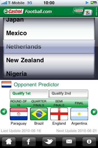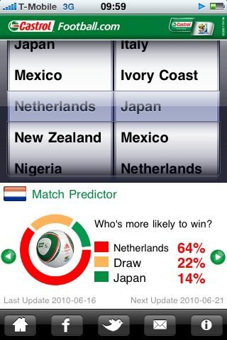 Tijdens het WK voetbal vliegen de voorspellingen je om de oren. Wie wordt de wereldkampioen, wie wordt topscorer, hoe ver komt Oranje? Hoewel statistieken niet alles zeggen, kun je er wel enigszins mee voorspellen hoe het toernooi zal verlopen, volgens Castrol. De sponsor van dit WK in Zuid-Afrika vormde castrolfootball.com om tot een iPhone-app met allerhande voetbalstatistieken. Als we daarop af moeten gaan, wordt Brazilie wereldkampioen.
