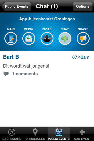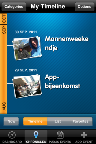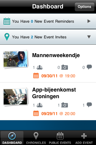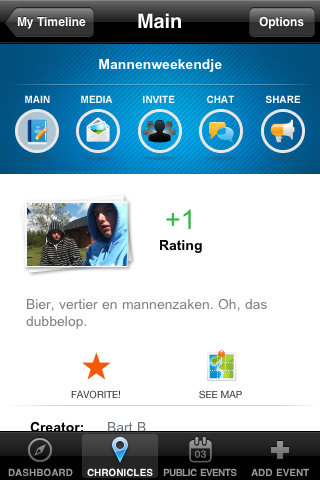 Chroniclr is bij uitstek geschikt voor groepen die vaak iets samen ondernemen. Het biedt de leuke mogelijkheid om van tevoren en achteraf te praten en foto’s te plaatsen over een evenement. Chroniclr slaat je evenementen fraai op in een tijdslijn en houdt die jaren bij in de app en op een website. Helaas moet je wel even door de zure appel heen bijten met een taai registratie- en inlogproces en ook vrienden uitnodigen kan handiger.