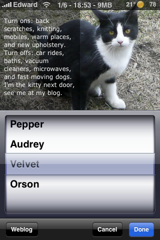 Wanneer je nu je iPhone geeft aan de nietsvermoedende gebruiker en deze op het scherm drukt gebeurt er iets dat hij niet zal verwachten… Misschien is het voor die gimmick nog de leukste toepassing. Je kunt kiezen uit vier verschillende huisdieren die deze belangrijke taak mogen uitvoeren. Zo zijn daar de katten Velvet en Orson en vuilnisbakkie Pepper en Sint Bernard Audrey. Waarschijnlijk is de applicatie toch vooral bedoeld voor het dierenliefhebbende of vrouwelijke gedeelte van de iPhone gebruikers. Waar ondergetekende er niet echt de lol niet van in kon zien verscheen er bij het tonen van de app aan de dierenliefhebster in huis een grote glimlach op het gezicht. Zinloos maar grappig dus. Of je er 0,79 euro voor overhebt is een tweede natuurlijk.