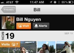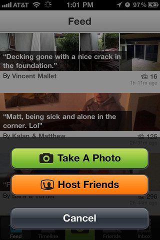 Op dezelfde strakke wijze als de nieuwsfeed met foto’s, toont Color for Facebook ook fraai andere aspecten van het netwerk. In het tabblad Timeline zie je eigen foto’s en foto’s waarop je bent getagd. Friends laat je de foto’s van vrienden bekijken en het tabblad Inbox geeft actuele likes, reacties en andere meldingen weer. Het middelste tabblad is een tikkeltje groter en groen uitgevoerd. Deze geeft je toegang tot twee opties: een foto uploaden of ‘Host Visit’. Dat laatste aspect is de omgekeerde versie van de functie waar Color om draait.