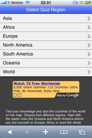 Er is verder geen high-score aan het spel verbonden. Een nadeel is de vele (soms beeldvullende) Google-advertenties die steeds in beeld zijn, maar afgezien daarvan zit Country Quiz goed in elkaar. Wil je eerst een tijdje je topo-kennis bijspijkeren, dan kun je van dezelfde ontwikkelaar eerst de webapp Countries bekijken. Ontwikkelaar Speedymarks heeft nog veel meer iPhone-webapps gemaakt, variërend van een online valutaomrekenaar (Currencies), wereldklokken (World Clockr) en een tool waarmee je je eigen snelheid kunt meten (SpeedoMeter)