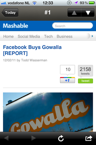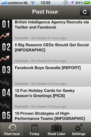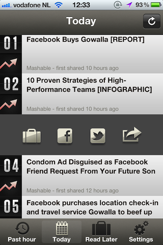 Uiteraard biedt Currently Technology News ook de mogelijkheid om berichten te delen. Standaard krijg je hiervoor Twitter en Facebook als opties, maar via een extra menu zijn ook diensten als Tumblr en Instapaper beschikbaar. Ook kun je een link mailen of openen in Safari. Deze deelopties zitten niet alleen in de browser, maar ook in de hitlijsten. Door naar rechts te swipen bij een titel komen de knoppen naar voren. Op die manier kom je ook een ‘koffertje’ tegen. Druk je daarop, dan wordt het artikel opgeslagen in de ingebouwde read later-lijst.