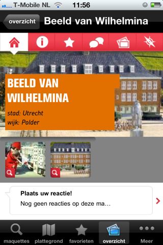 Behalve de galerij is er ook een kaart van Madurodam waar de locatie van de maquette op getoond wordt. Eveneens is er korte geschreven informatie over het monument. Items kunnen worden toegevoegd aan favorieten en er is zelfs een mogelijkheid om een reactie bij maquettes te plaatsen. In het tabblad ‘Overzicht’ kunnen de maquettes op foto worden bekeken en een losse plattegrond is wellicht handig om bij je te hebben als je door het attractiepark loopt. De app weegt 2,8 mb en haalt de video’s dus van internet. Dat kan lastig zijn als je in Madurodam de filmpjes ter plekke bij een maquette wil zien. Maar ook zonder een bezoek aan het park geeft de app een leuke inkijk in de geschiedenis van 82 Nederlandse historische gebouwen en voorzieningen.