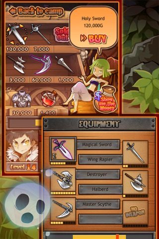 In totaal kun je zes verschillende wapens die je bij je hebben, waaronder verschillende zwaarden en bijlen. Elk wapen heeft andere eigenschappen als het gaat om snelheid en de hoeveelheid schade dat het toebrengt. Daarnaast kun je ook items kopen zoals een harnas en een toverdrankje.