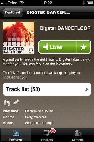 Digster is een gloednieuwe applicatie voor de iPhone en iPod touch die maar in een paar landen werkt en Nederland is daar één van. In de app kun je aangeven voor welke gelegenheid je muziek wilt horen. Zit je aan tafel of doe je iets romantisch? Wil je energieke muziek of stemmige? En welke genres mogen er niet tussen zitten? Geef je voorkeuren aan en Digster beveelt je afspeellijsten aan, die je vanuit de applicatie meteen kan openen in de Spotify-app.