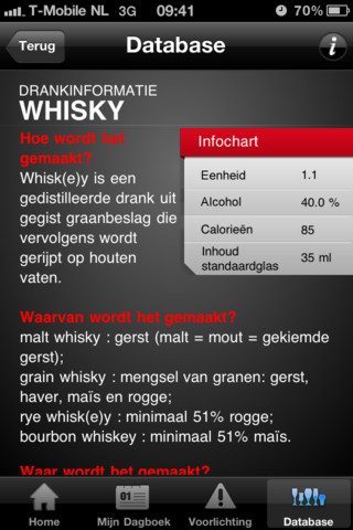 Leuker zijn echter de teksten van gelijksoortige lengte die je vindt in de drankdatabase. Die geeft per dranksoort aan hoe het wordt gemaakt, waarvan het wordt gemaakt, waar het wordt gemaakt en hoe het ontstaan is. Wist je bijvoorbeeld dat het eerste biertje vermoedelijk is gebrouwen in Mesopotamië, het toenmalige Irak? In een Infochart bij de tekst zie je wat het alcoholpercentage van de soort is, hoeveel calorieën er in zitten, voor hoeveel eenheden het telt en hoe groot de inhoud van een standaardglas is.