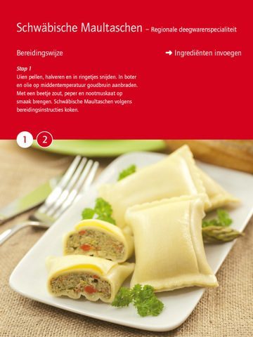 De indeling van de app en de instructies voor de gerechten zijn echter lovenswaardig nuchter. Met een tik op het beeldscherm verschijnt onderin beeld een scrollbalk om door pagina’s te bladeren en kun je met een lijst-knop linksboven een pagina-overzicht opvragen. Elk gerecht bestrijkt één pagina en dat maakt het bereiden ervan wel zo handig. Gerechten hebben meerdere stappen die met oplopende cijfers aan de zijkant of onderkant van de tekst te vinden zijn. De instructieteksten zijn kort, maar erg duidelijk. Met de knop ‘Ingrediënten invoegen’ zie je in een transparant pop-up menu wat de benodigdheden zijn voor een gerecht. Een grote foto van het beoogde eindresultaat blijft altijd in beeld, ongeacht of de iPad in horizontale of verticale stand staat. De app is fraai in zijn eenvoud.