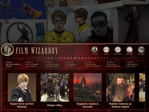 Met een prijs van 10,49 euro is Harry Potter Film Wizardry beslist niet de goedkoopste iPad-app denkbaar, maar het onderscheidt zich in bestandsgrootte dan ook flink van veel andere magazines en boeken. De applicatie is maar liefst 992 MB groot en die ruimte is nodig voor niet eerder gepubliceerde foto’s van de acht Harry Potter-films, animaties, een kaart en een tijdlijn die de ontwikkeling van Daniel Radcliffe als steeds oudere hoofdrolspeler laat zien. Ook zijn er verschillende 3D-objecten te zien die vroeg of laat voorkomen in de boeken – en dus films. Ook video’s ontbreken niet. Een druk maar deftig hoofdmenu (zie afbeelding) biedt toegang tot de verschillende secties, waarin vaak ook veel te lezen valt. De gehele applicatie is Engelstalig.
