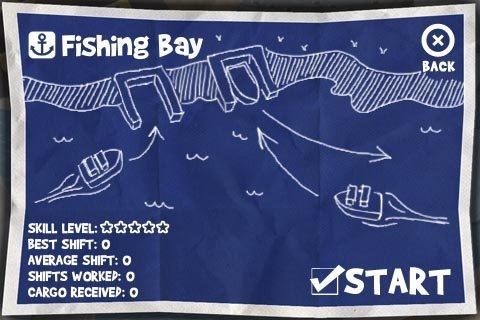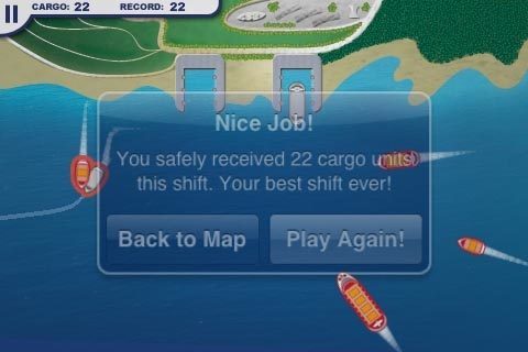 Bij deze eerste indruk heb ik alleen gekeken naar de eerste haven, die je niet hoeft te unlocken. Er zijn twee losplaatsen zichtbaar, naast elkaar gepositioneerd. Op zich is het eerste level niet moeilijk, vooral omdat de schepen niet vanuit 360 graden rondom het scherm binnen kunnen komen (aan de bovenrand van het scherm is alleen maar land). Bij de andere twee havens wordt het iets lastiger omdat de ruimte om te manoeuvreren kleiner is (kaart 2) of omdat de schepen van alle windrichtingen komen aanvaren (kaart 3). In het eerste level hebben alle schepen dezelfde kleur lading, waardoor het niet uitmaakt bij welke losplaats je aanlegt. Bij het derde level zijn er verschillend gekleurde losplaatsen: oranje en paars, zodat het net even iets ingewikkelder wordt: de lading van de schepen is ook oranje en paars. Net als bij Flight Control kun je je scores automatisch uploaden naar een server.