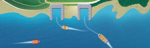 - De tweede haven: hier kunnen schepen van drie kanten aankomen. En je moet rekening houden met draaikolken (rechtsboven).