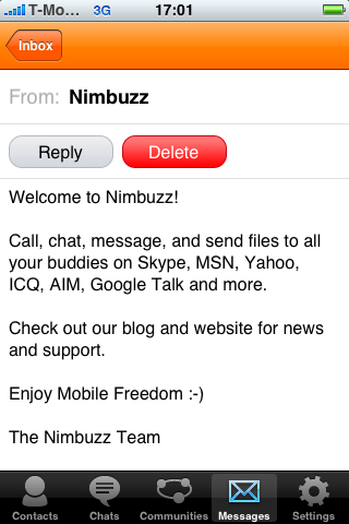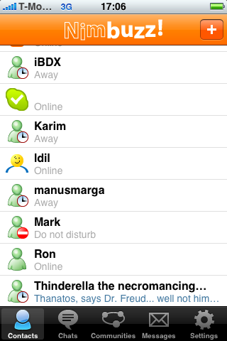 Vrijdag krijg ik een iphone 3g, als Nimbuzz net zo werkt op de Iphone als op m’n SEv630i dan vind ik het een super app. bellen via WiFi lijkt me helemaal geweldig, dan kan ik mijn oude cpu ontlasten en MMO-en en via de Iphone skypen. Geweldig!
