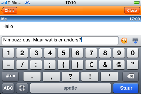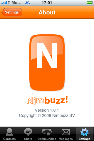 Nimbuzz stuurde ons een persbericht over hun nieuwste applicatie: Nimbuzz voor de iPhone. Met de applicatie kun je chatten, bellen en berichtjes sturen via alle populaire sociale netwerkdiensten en -protocollen: Skype, MSN/Windows Live Messenger, Google Talk, MySpace, Facebook, Hyves en meer. Het eerste waar je aan denkt bij zo’n applicatie: Fring! De insteek is inderdaad niet zo verschillend: grotendeels dezelfde protocollen worden ondersteund en net als bij Nimbuzz is het bij Fring (zonder hack) alleen mogelijk om via Wi-Fi te bellen. Bij Nimbuzz kun je in landscape-weergave chatten en een persoonlijke boodschap instellen. Nieuwe contactpersonen toevoegen kan ook, maar alleen de communities Nimbuzz, Google Talk en Jabber worden daarbij ondersteund.