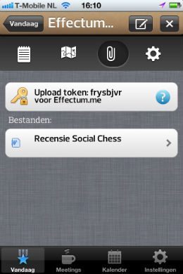Daarnaast neemt Effectum ook nog even de functionaliteit van Apple’s Find My Friends over. Genodigden kunnen hun locatie doorgeven, waarna de plaats van de afspraak en die van de deelnemers op dezelfde kaart zichtbaar zijn. Het is een van de functies die je vindt in het overzicht van de afspraak. Daarin laat een algemeen tabblad de algemene afspraakgegevens zien, zoals de naam, een toelichting, de datum, het tijdstip en de geadresseerden. Het tabblad met de paperclip geeft toegang tot de bestanden die zijn uitgewisseld. Daarboven zie je een balk met het adres en de sleutel voor het uploaden van bestanden binnen de afspraak. Je kan op de Upload Files-pagina van Effectums website terecht om de bestanden vanaf een pc of Mac te uploaden. Helaas is er geen mogelijkheid om direct bestanden vanaf de iPhone te wisselen.