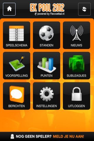 De toepassing is qua opzet precies gelijk aan de eigen app die Flexvoetbal eerder al voor de iPhone en iPod touch uitbracht. In het hoofdmenu met negen knoppen, zijn er in eerste instantie maar vier bereikbaar: Speelschema, Standen, Nieuws en Inloggen. Daardoor houdt de app zichzelf ook staande als nieuwsbode voor het EK-schema en de bijbehorende ontwikkelingen, als je niet actief wilt meedoen aan uitslagen gokken. Als je inlogt of registreert, krijg je ook toegang tot de knoppen Voorspelling, Punten, Subleagues, Berichten en Instellingen.